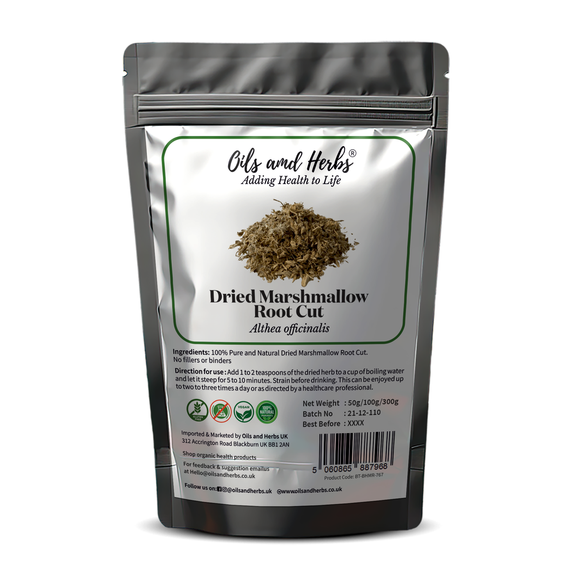 At Oils and Herbs UK, we ensure that every batch of dried marshmallow root cut is carefully selected for quality, freshness, and purity, making it suitable for herbal teas, decoctions, and botanical preparations.
