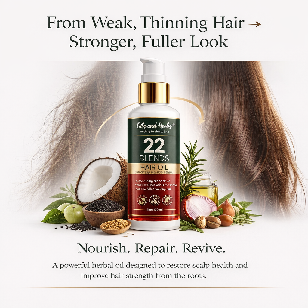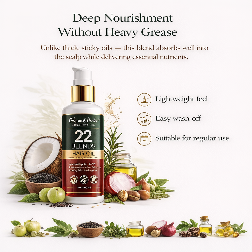 Your hair doesn’t need harsh chemicals — it needs the right balance of nourishment and care. 22 Blends Herbal Hair Oil is designed to support hair growth, reduce hair fall, and improve scalp health naturally.