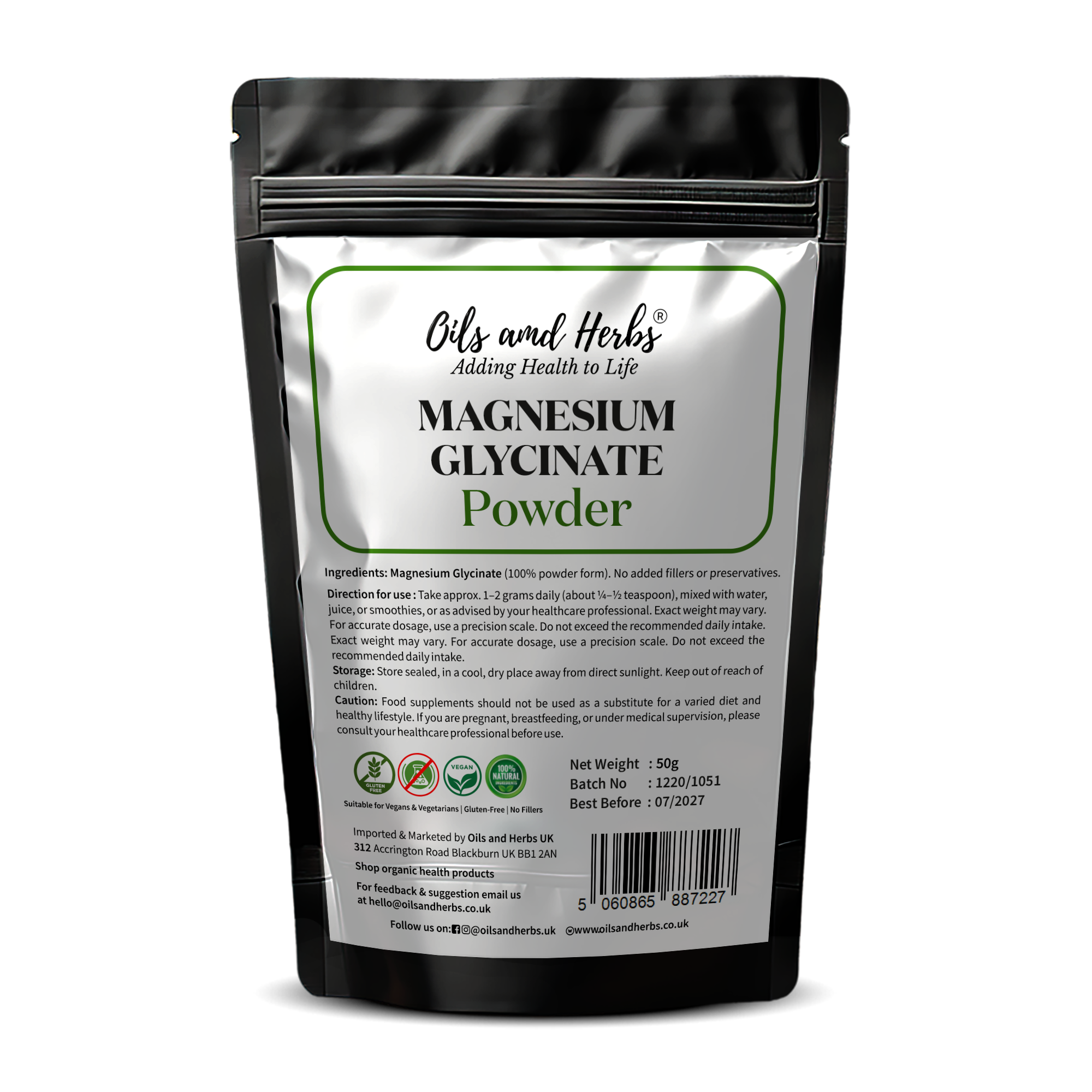 Take 1–2g daily (¼–½ teaspoon) with water or juice. Equivalent to approx. 140–280mg elemental magnesium per serving.